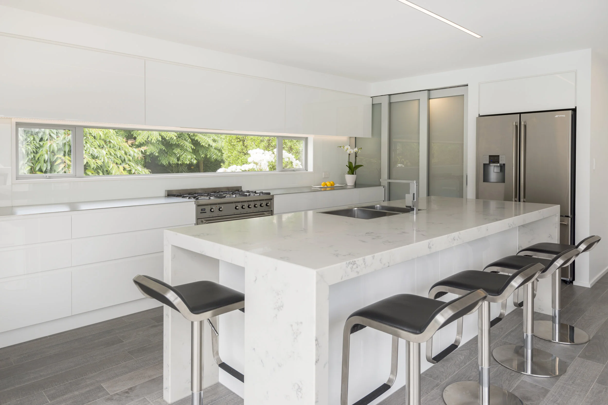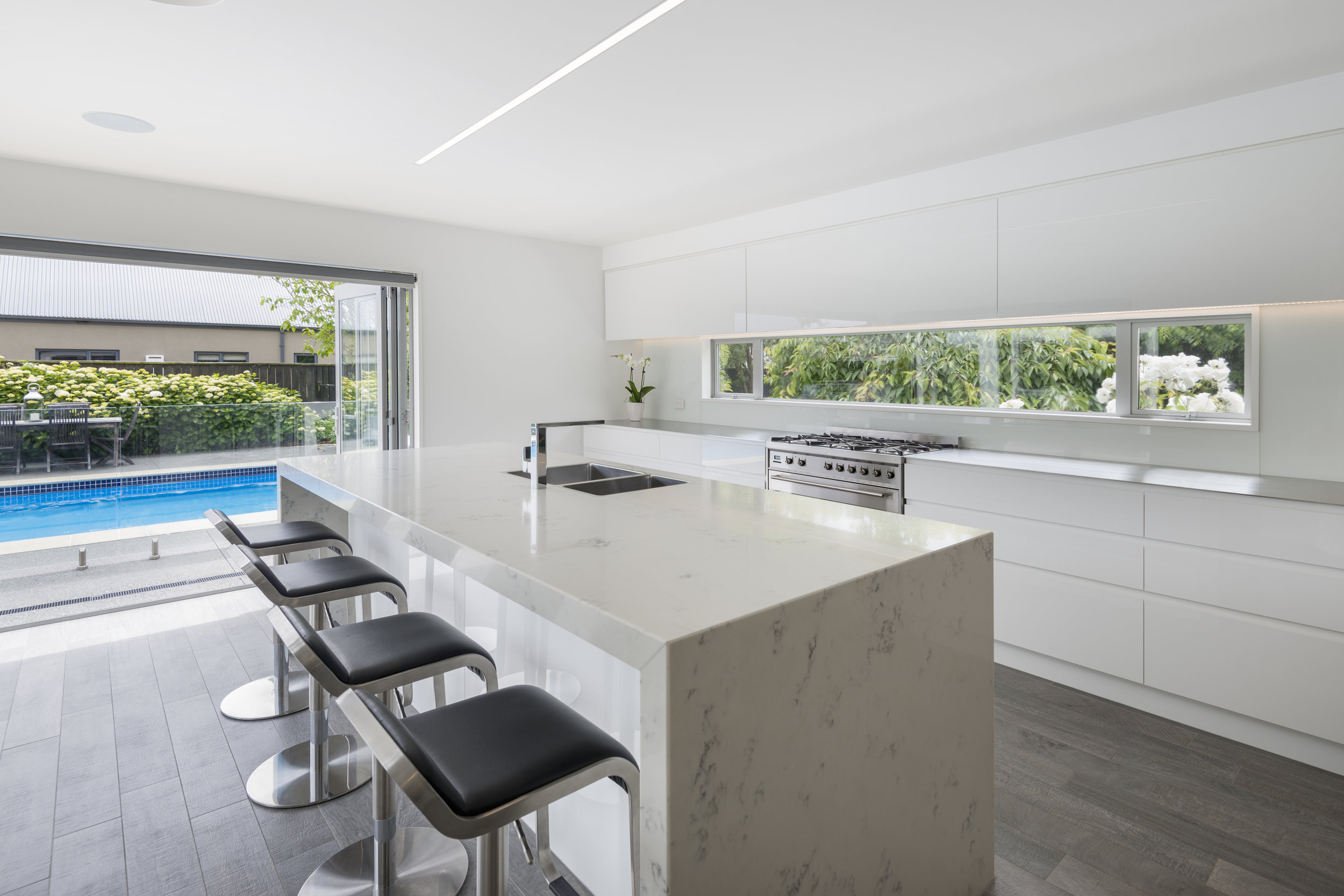 It's hard to believe this used to be the lounge space! The kitchen area was moved, and is now positioned close to the pool and bbq area with large opening doors onto the area. The clients wanted the area to be easy for the family to use, as well as stylish for entertaining. With an easy clean minimal finish, the client wanted to be able to wipe up and put away in the pantry.